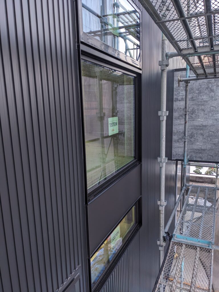 [現場リポート]阿賀野市 S様邸 2026/02/17 新築工事の外壁工事が完了しました。外部の換気フードやアンテナ等電気屋さんのお仕事が終わると、外観のお披露目です。 細部までこだわり抜いたデザインをお楽しみに・・・写真は1階と2階をつないだ連想の窓。